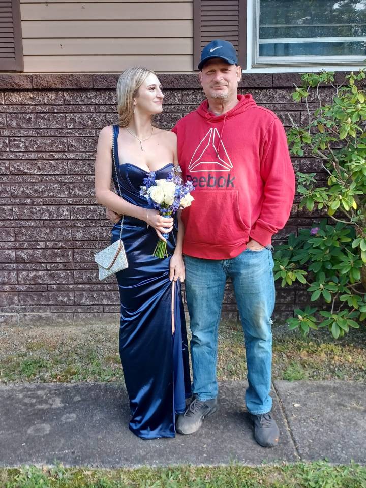 A father and daughter posing for a photo.  The daughter is wearing a dark blue dress and carrying a bouquet.