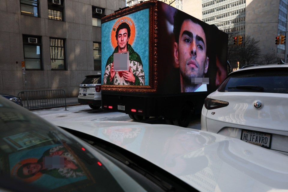Digital billboard truck displaying image of Luigi Manigione near Manhattan Criminal Court.