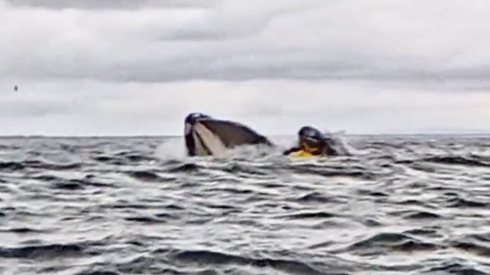 The 24-year-old, who was paddling in his inflatable yellow kayak at around 3 pm, had not spotted the whale until part of its mouth emerged from the water.