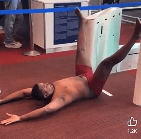 He was filmed lying on the floor, raising his feet in the air and then turning over onto his hands and knees with his butt in the air, facing the waiting area.
