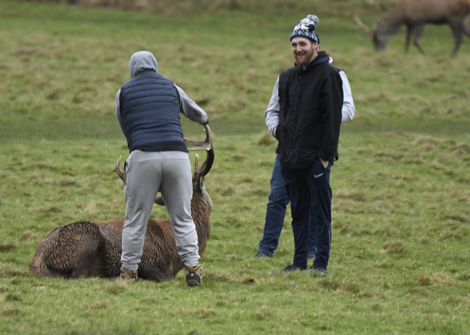 THIS is the shocking moment thugs attacked a wild stag by pulling its antlers and hitting its rump.