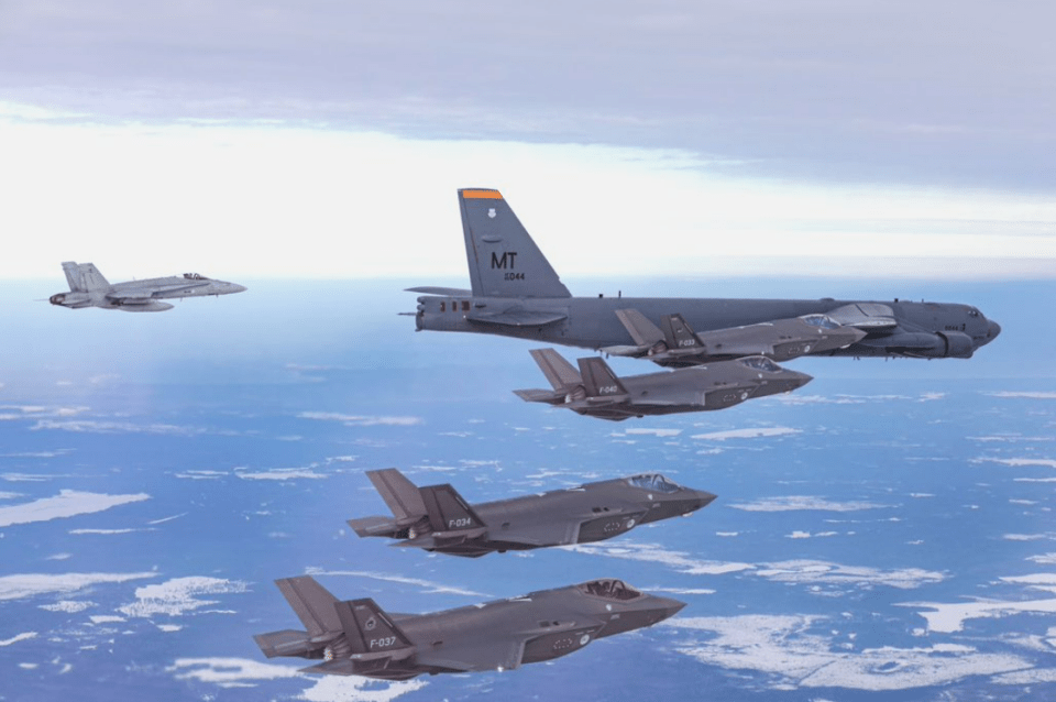 A US B-52 Stratofortress bomber flying over Estonia alongside F-35s on MondayCredit: X
