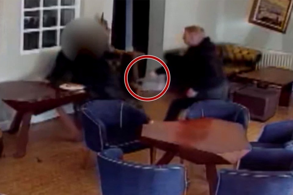 Footage showed the thug slashing at the terrified 25-year-old in the conservatory of the Pear Tree Inn at Hindlip, Worcestershire.