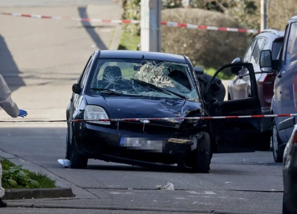 A damaged car at the scene after a vehicle was driven into pedestrians in Mannheim