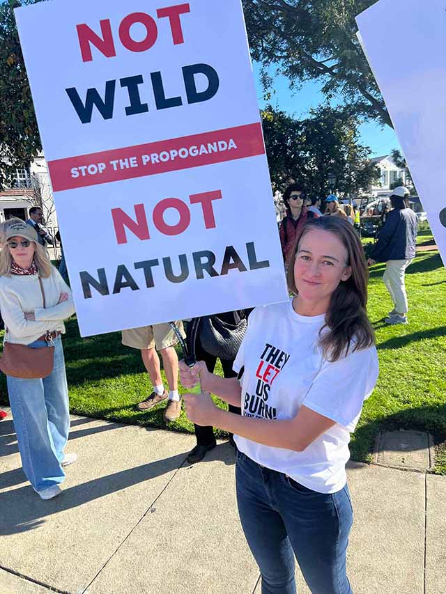 Amid the crowd’s stories of loss, Ann Juliano’s stood out. Having grown up in the Palisades, she held a sign declaring, “Not Wild. Not Natural. Stop the Propaganda.”
