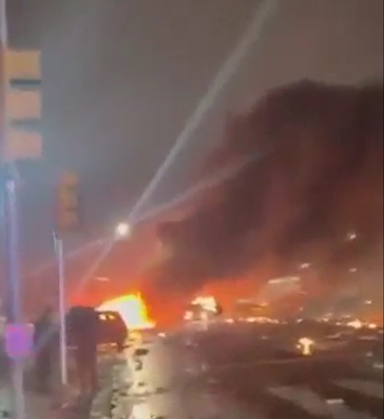 Black clouds of smoke cane be seen billowing through the sky as dozens of terrified onlookers rush to safety.