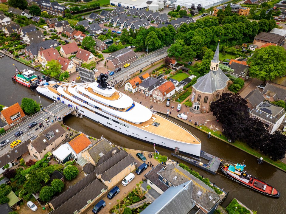 Aerial view of a mega yacht passing through a narrow canal in a Dutch village.