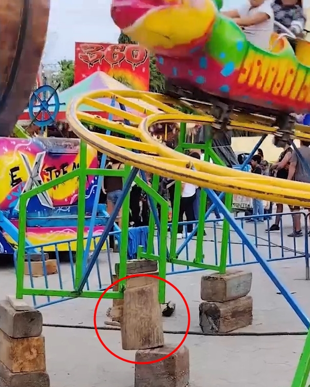 Footage captured by an alarmed parent shows the large metal rollercoaster propped up by a dozen wooden blocks.