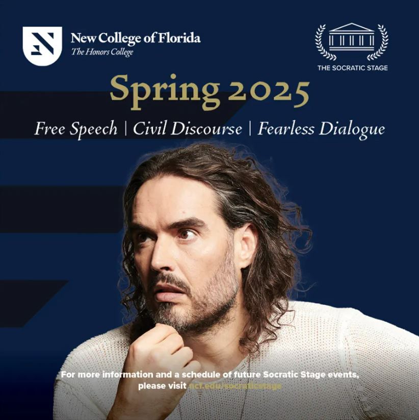 Russell Brand speaking at New College of Florida's Socratic Stage, Spring 2025.