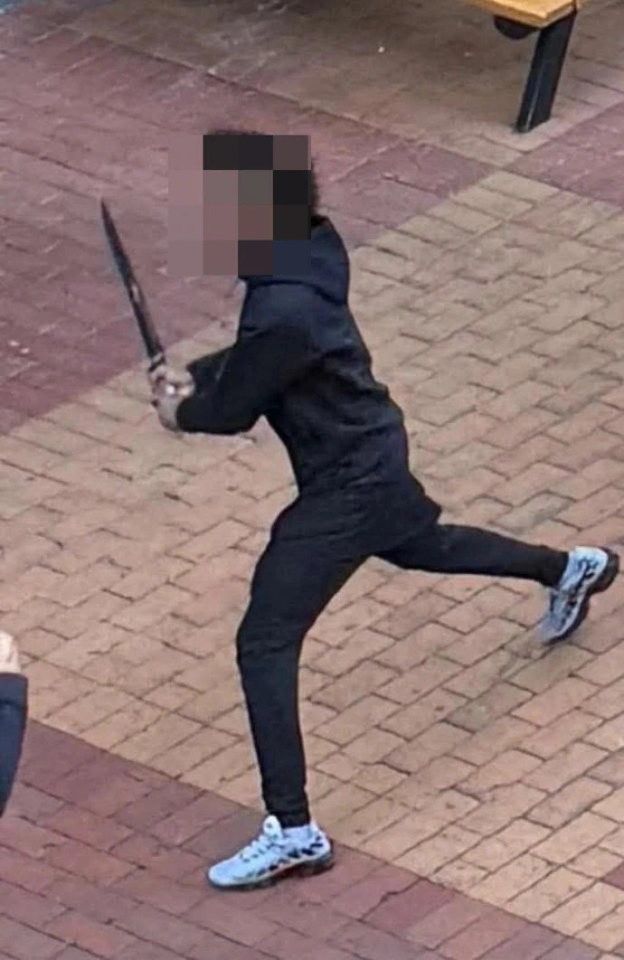 Shocking images showed a man carrying a massive machete, about the length of his own arm, and threatening another two people with it.