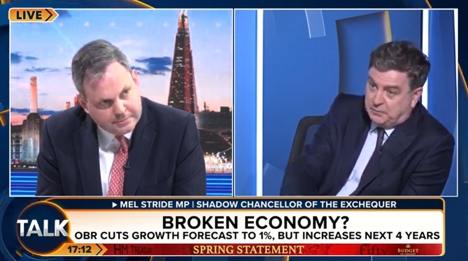 Screenshot of a TV segment discussing the UK economy, featuring Mel Stride MP.