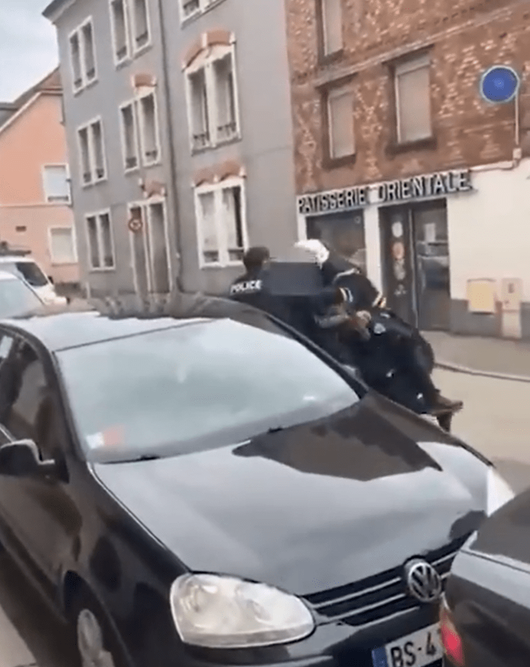 Dramatic footage shared on social media shows officers chasing the suspect down Rue de Lavoisier before restraining him on the road.