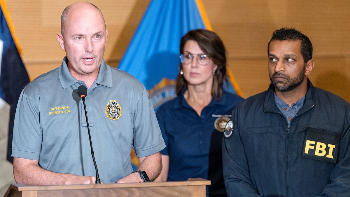 At a press conference, FBI director Kash Patel (right) remained silent while Utah Governor Spencer Cox urged the public to help identify the suspect