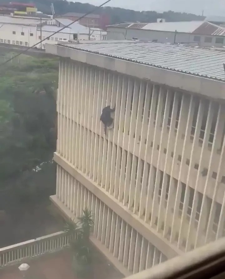 Footage shows the wily defendant clinging onto vertical beams on the outside of the court building, perilously high up.