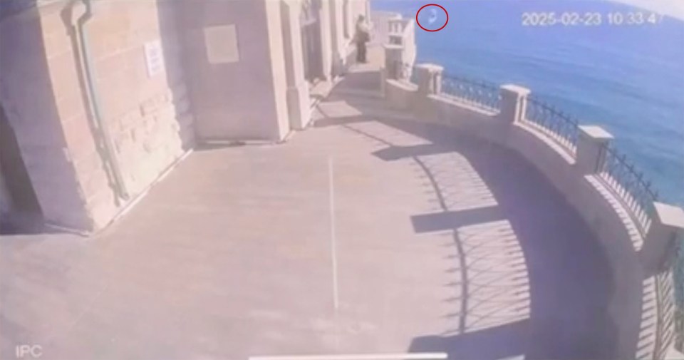 Appalling footage shows the moment the cat was thrown from an observation deck over the walls of Swallow’s Nest, a castle in Russian-occupied Crimea.