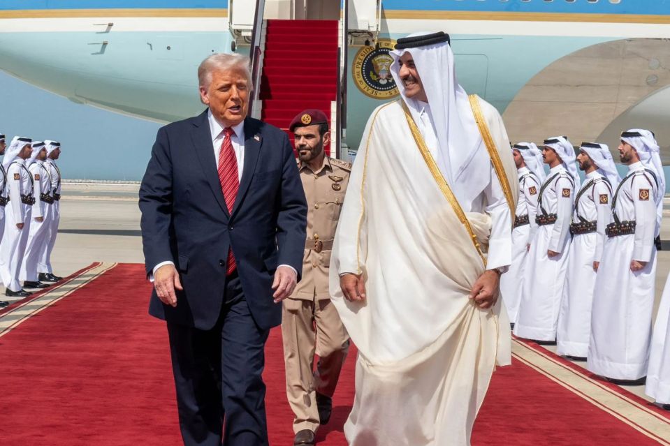 US President Donald Trump is greeted by Qatar’s Emir Emir Tamim bin Hamad Al Thani
