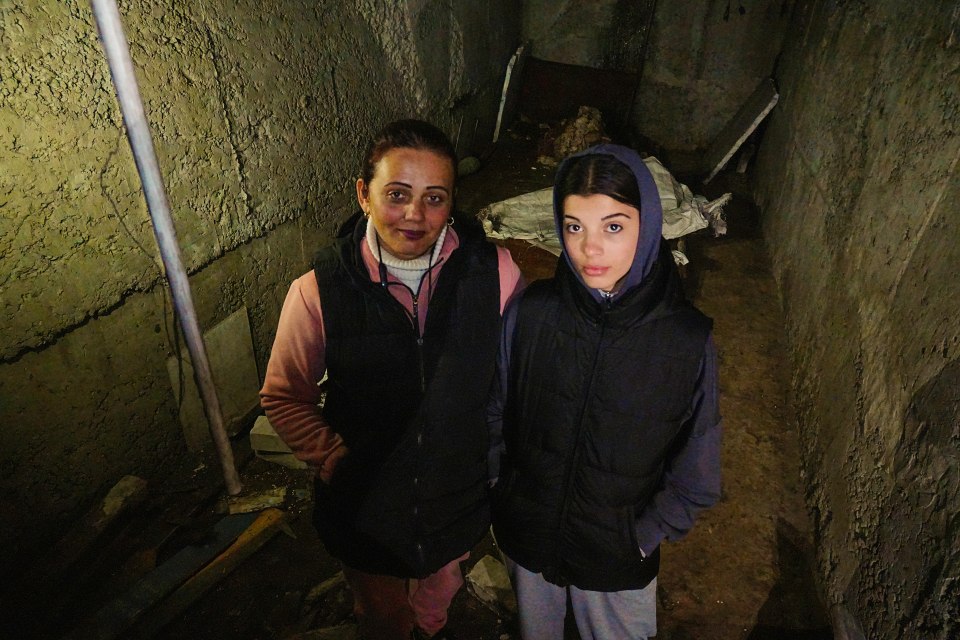 Lubov Bobro and daughter Olya in the cellar they use to shelter from shelling at home in Saltivka