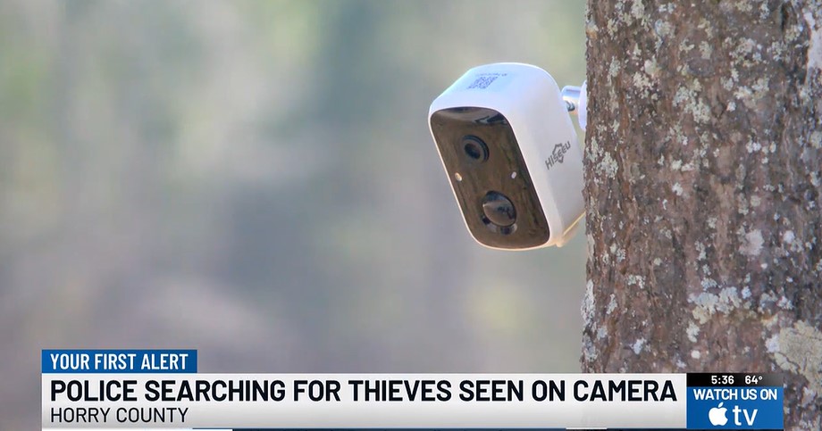 Security camera mounted on a tree; police searching for thieves.