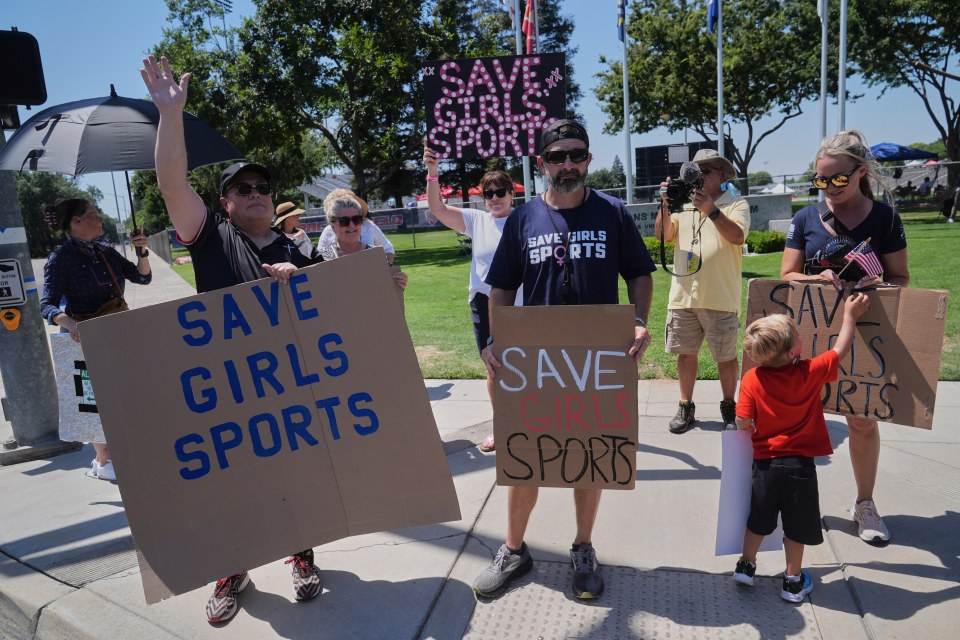 Protestors holding signs that read "Save Girls Sports" outside a stadium.