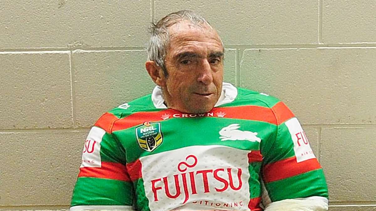 The man in the rabbit suit is retired panelbeater Charlie Gallico, 81, who has been the mascot ever since Souths were re-admitted into the NRL in 2002.