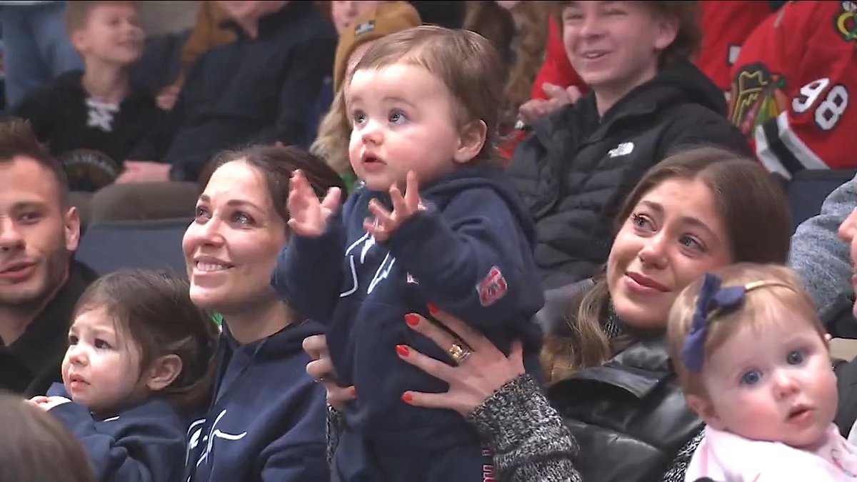 Supporters of the home team and visiting Chicago Blackhawks both joined in a chorus of traditional birthday song as the blushing baby Johnny stood on the lap Meredith Gaudreau’s sister, Lilly. Meredith, meanwhile, was seated alongside Johnny and Lily with her and Johnny’s other child, daughter Noa Harper.