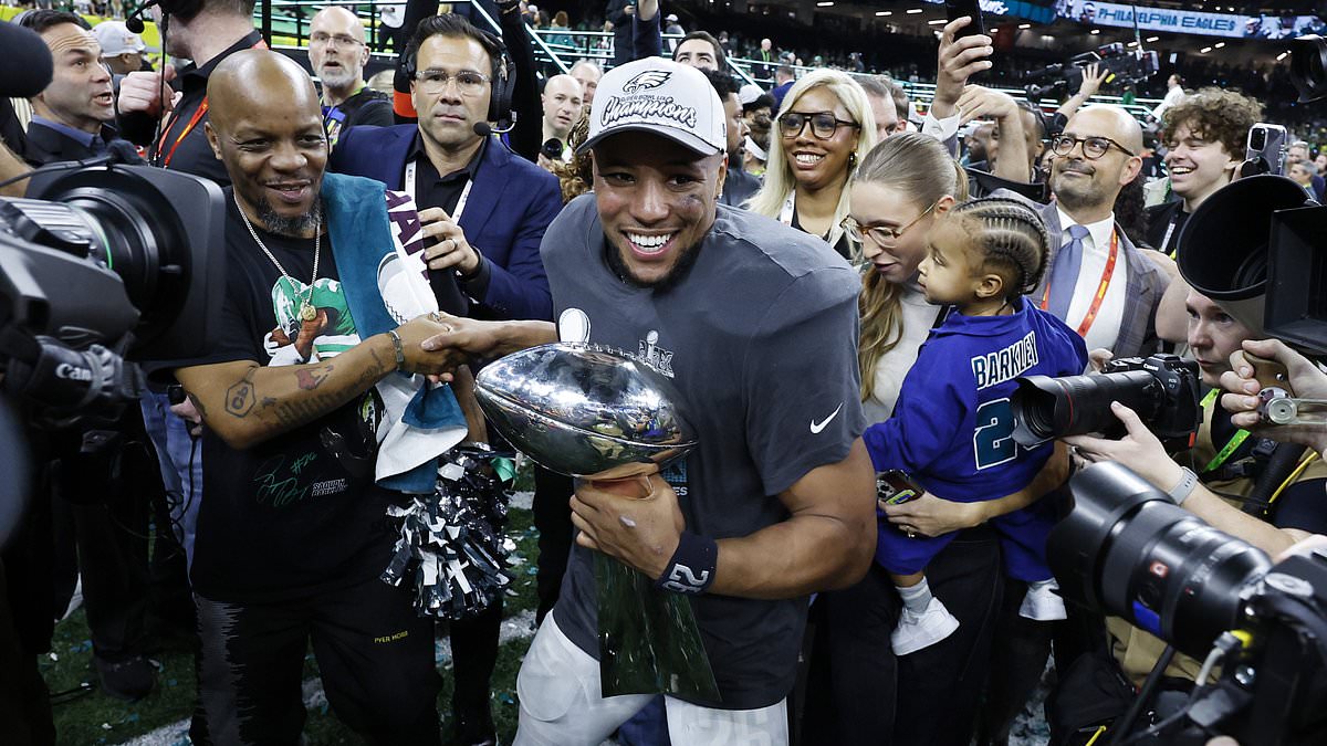 Philadelphia Eagles running back Saquon Barkley holds the Vince Lombardi Trophy during celebrations after the Eagles defeated the Kansas City Chiefs 40-22 in Super Bowl LIX