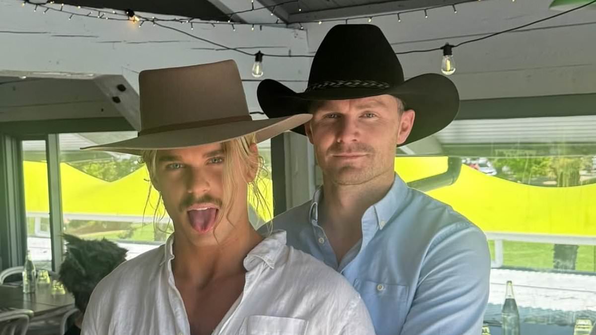 Bailey Smith (left, pictured with Patrick Dangerfield) has been blasted after the footy star appeared to make a reference to Brokeback Mountain on his Instagram. The Geelong player had dressed with a western theme, before writing: 'This is what losing a Granny does to ya,' on his Instagram