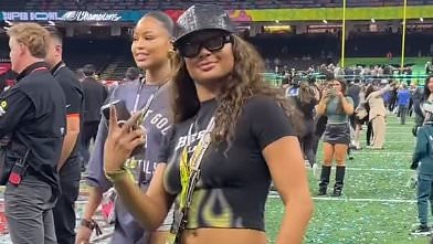 The influencer and media personality posed on the field as the Eagles celebrated their second Super Bowl triumph, while even holding up some green and white confetti at one stage.