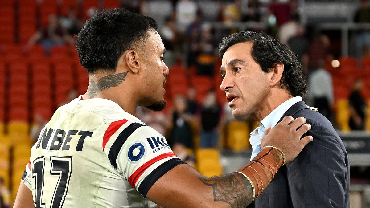 Sydney Roosters firebrand Spencer Leniu confronts NRL legend Johnathan Thurston after the match against the Brisbane Broncos on Friday night