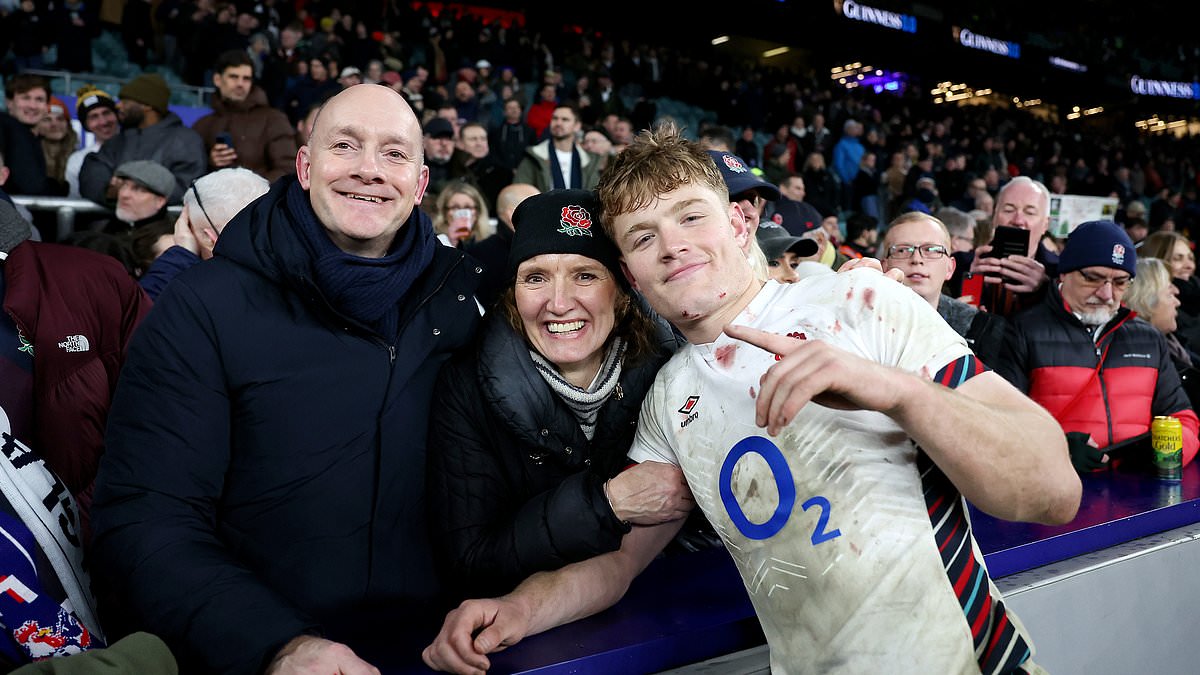Fin Smith pictured after Saturday's game posing for photo with parents Andrew and Judith