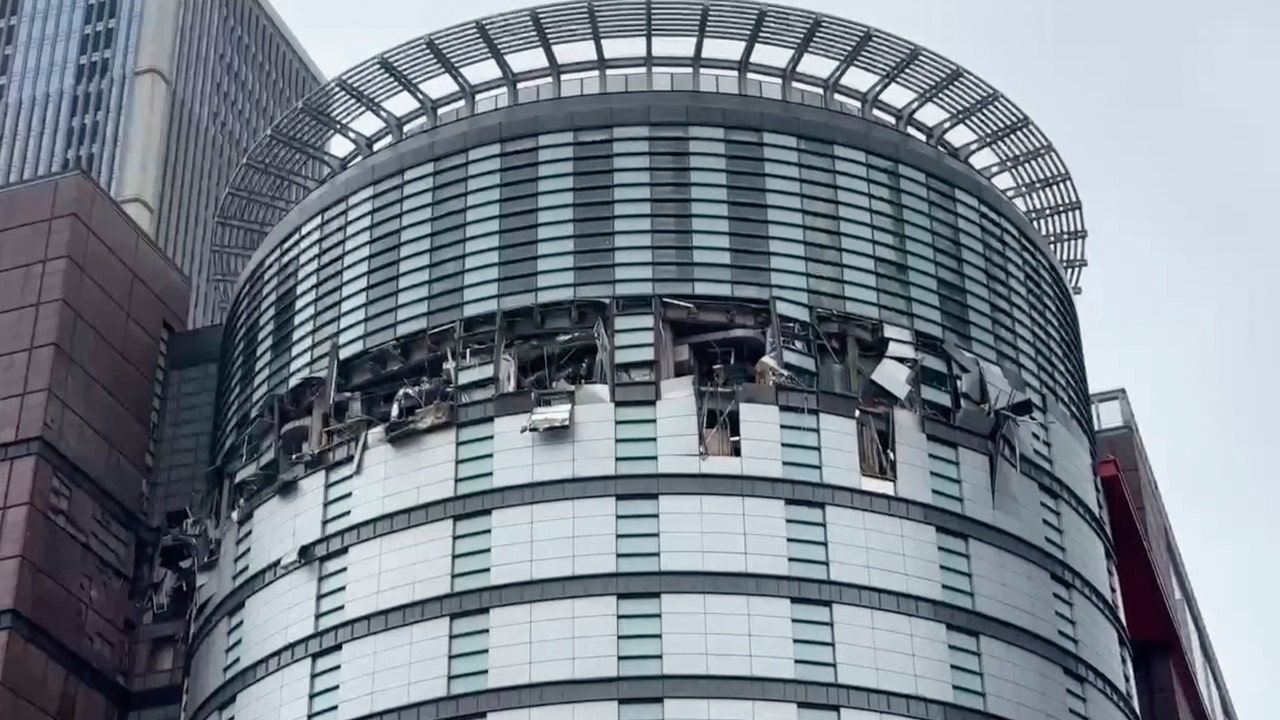 This image taken from video by Taiwan’s TVBS shows the damaged facade of the Shin Kong Mitsukoshi department store after an explosion in Taichung city in Taiwan on Thursday, Feb 13, 2025. (TVBS via AP)