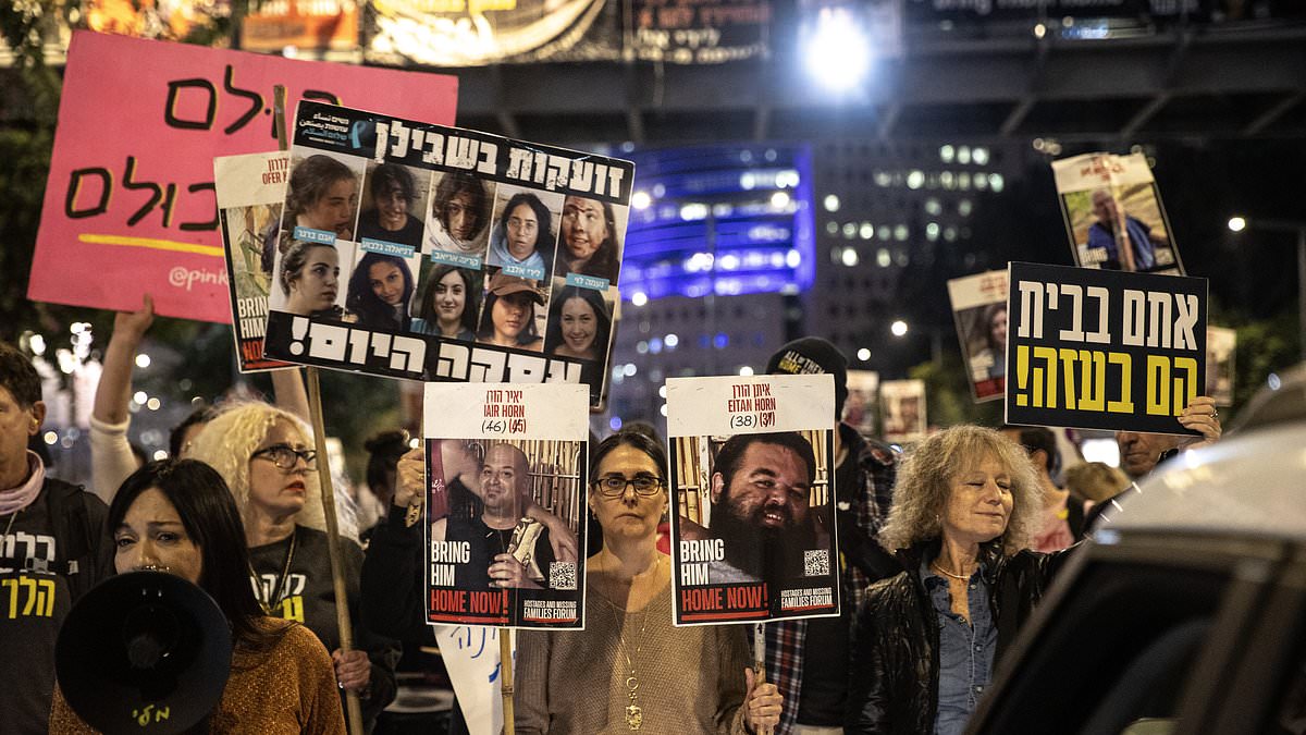 Relatives of Israeli hostages in Gaza gather in front of the Ministry of Defense to hold demonstration demanding a ceasefire and a hostage swap agreement in Gaza yesterday
