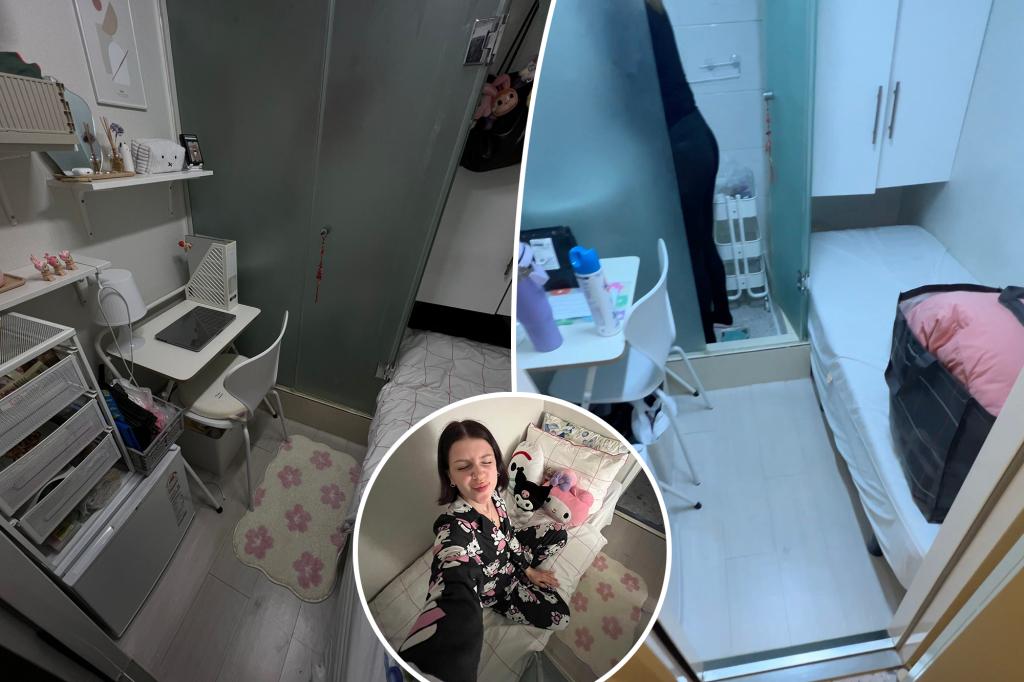 The micro-apartment, measuring 8 feet by 9 feet, is also referred to as a goshiwon. It includes a single bed, a desk with a chair, shelves for storage, a small refrigerator, and an integrated wet room that serves as a toilet.