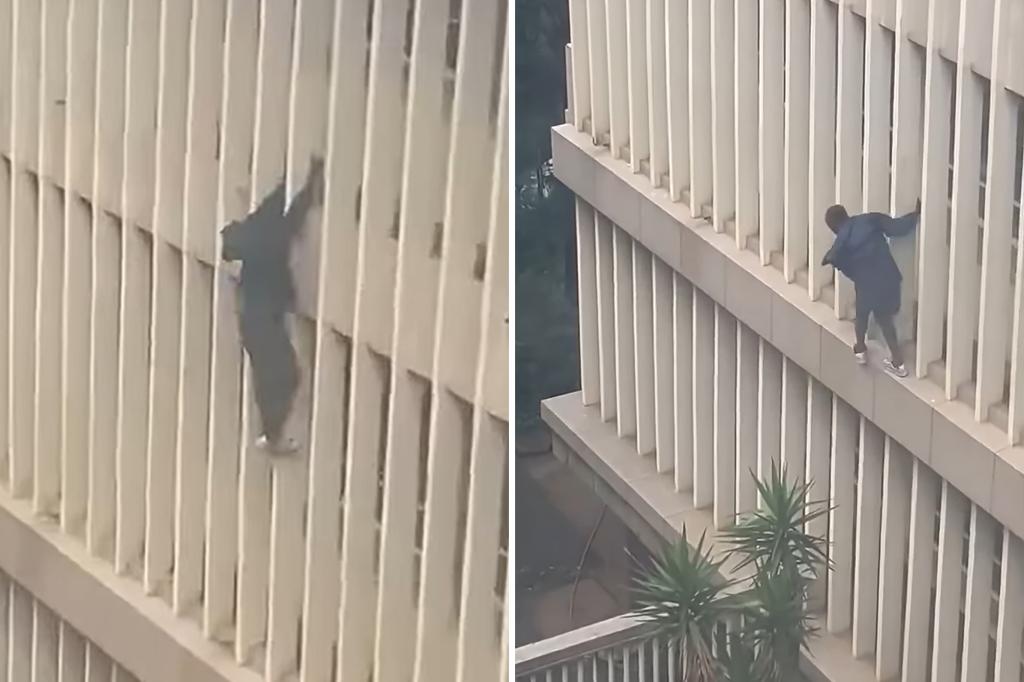 An onlooker filmed him as he slowly slid down the building and finally jumped to the ground, sprinting off into the nearby neighborhood.