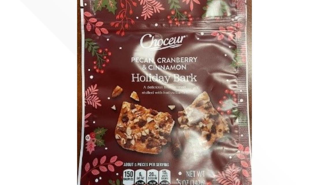 The recalled Pecan, Cranberry & Cinnamon Holiday Bark is sold in 5-ounce Choceur stand-up pouch bags with these lot numbers and dates: