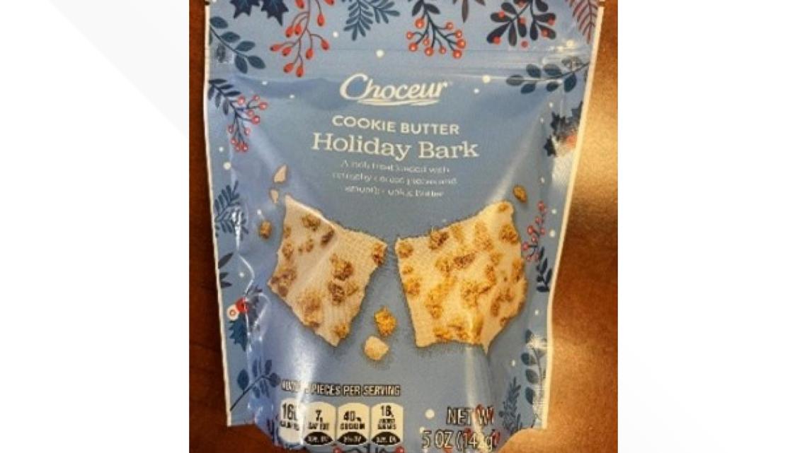 The recalled Cookie Butter Holiday Bark is sold in 5-ounce Choceur stand-up pouch bags with the following lot numbers and dates:
