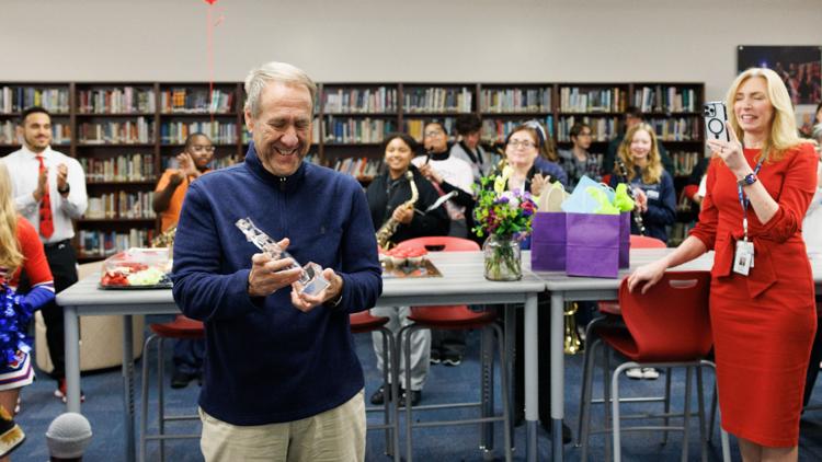 Begley received the award and a $1,500 check on January 13 during a surprise celebration at Wolfson, attended by students, teachers, administrators, and members of the Wolfpack Marching Band and cheerleaders. Duval County Public Schools Superintendent Dr. Christopher Bernier and several other local leaders were also present.