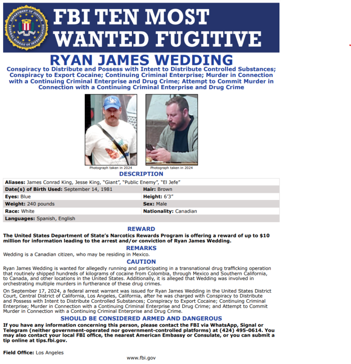 Wedding is wanted for allegedly running a transnational drug trafficking network that shipped large amounts of cocaine from Colombia through Mexico and Southern California to Canada and other locations in the U.S. He is also wanted for orchestrating multiple murders and an attempted murder, according to the FBI.