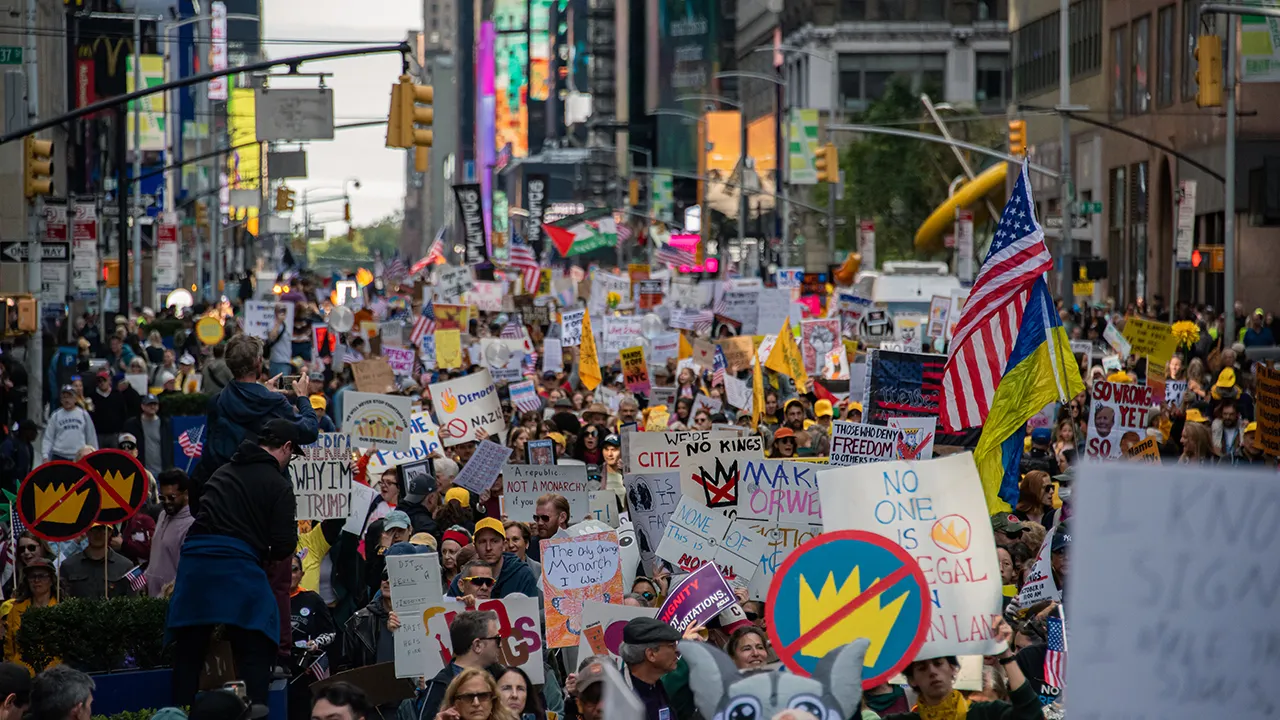 Over 100,000 people gathered and marched in Manhattan for the “No Kings” protest in New York City on Oct. 18, 2025. (Neil Constantine/NurPhoto via Getty Images)