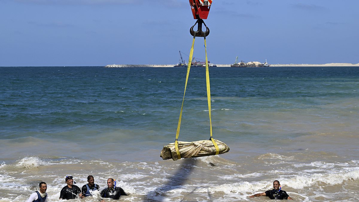 Archaeologists and divers used cranes to pull statues and remnants from the waters at Abu Qir bay in Alexandria