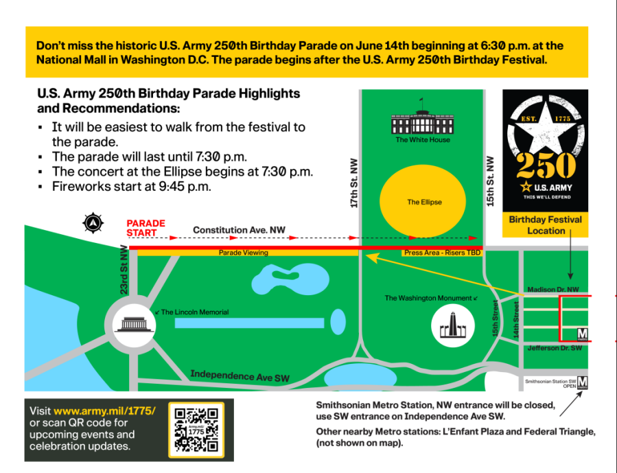 On Thursday, the media will preview aircraft participating in the parade, including the UH-60 Black Hawk, AH-64 Apache, and CH-47 Chinook. An Army Birthday Run/Walk is set for Friday at Joint Base Meyer-Henderson Hall.