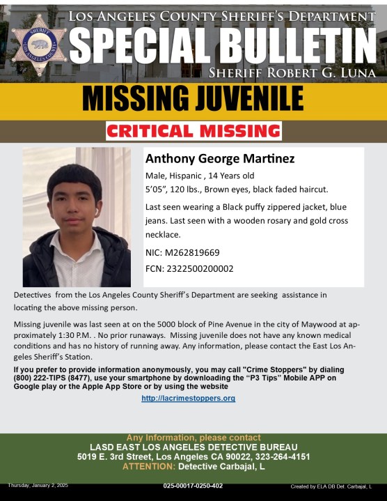 Anthony George Martinez was last seen around 1:30 p.m. on the 5000 block of Pine Avenue and has been described by the Los Angeles County Sheriff’s Department as a “critical missing” juvenile in a special bulletin.