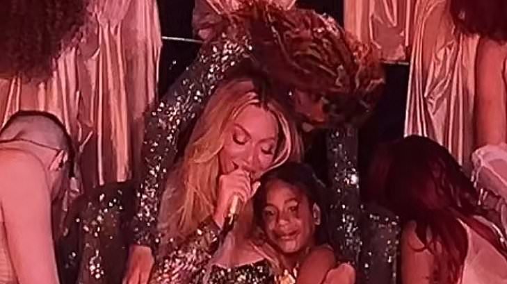 Fan footage posted to social media showed Beyoncé sitting in front of a human pyramid of backup dancers while Rumi sat next to her and embraced her.