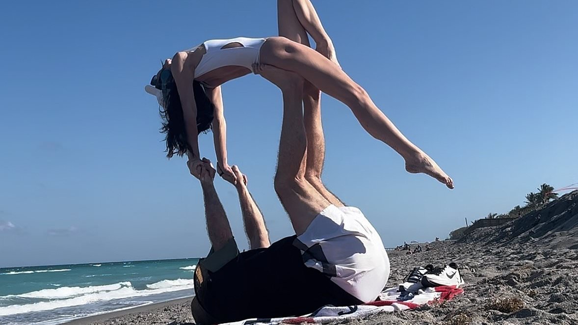 Several images capture Belichick on the beach, supporting his girlfriend with his legs and arms while she planks facing upwards. In another photo, he is depicted solely using his legs to hold her weight.