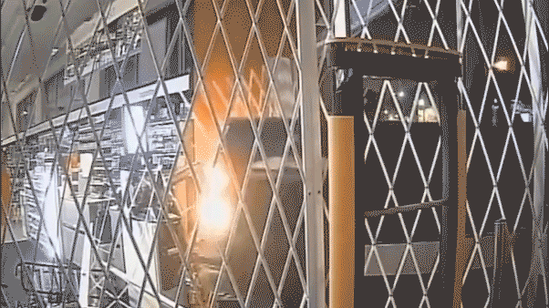 As the suspects try to haul the ATM out, they leave behind a trail of destruction from the truck’s repeated assaults. Eventually, the ATM is torn from its placement and dragged across the parking lot as the truck makes a hasty exit.
