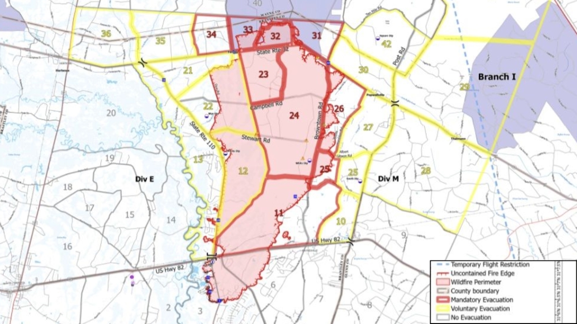 Evacuation orders expanded throughout the week. By Friday morning, a mandatory evacuation covered residents from Browntown Road to Old Post Road at Highway 32 to Highway 110. Wayne County Emergency Management issued a mandatory order for all residents from the Brantley County line to Ten Mile Road between Post Road and Wire Road.