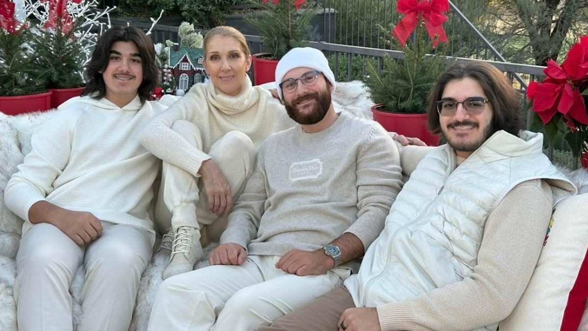 The snap, taken at Christmas, shows a smiling Celine matching her boys in cream ensembles as they relax at the family home in Las Vegas.