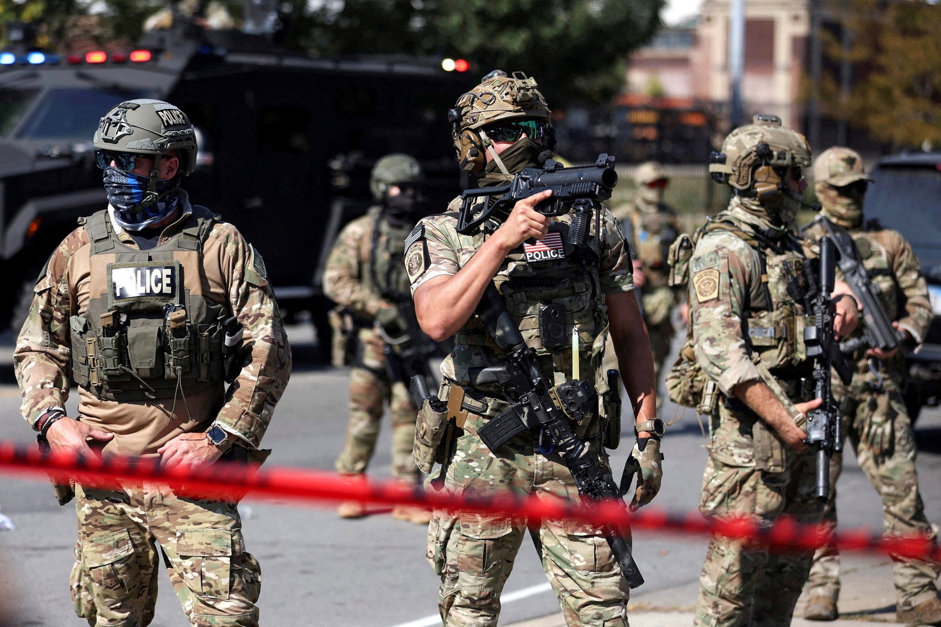 Law enforcement officers during a standoff with U.S. Immigration and Customs Enforcement (ICE) and federal officers in the Little Village neighborhood of Chicago, Oct. 4, 2025.Jim Vondruska/Reuters