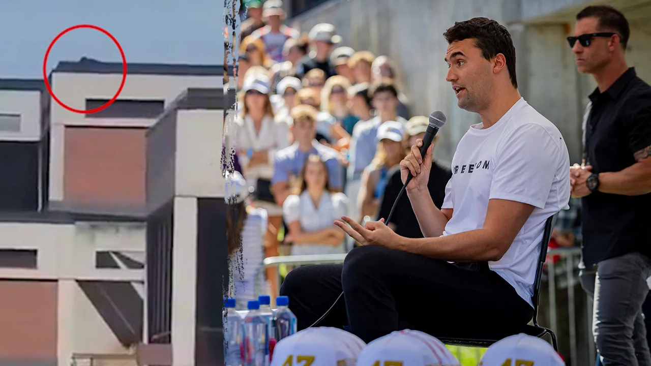 This still image taken from video appears to show a figure wearing black on top of a roof across from where Kirk was fatally struck. (Credit: @Doug_Zimmer1/X)