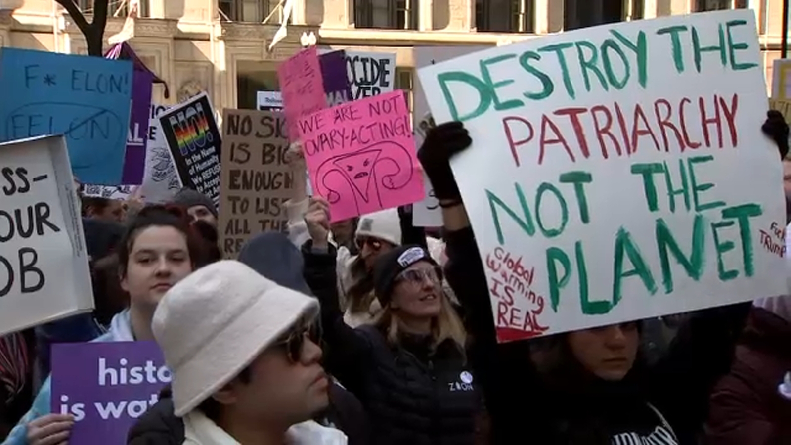 International Women's Day march, rally, events held in Chicago; protesters downtown at Daley Plaza, Trump Tower
